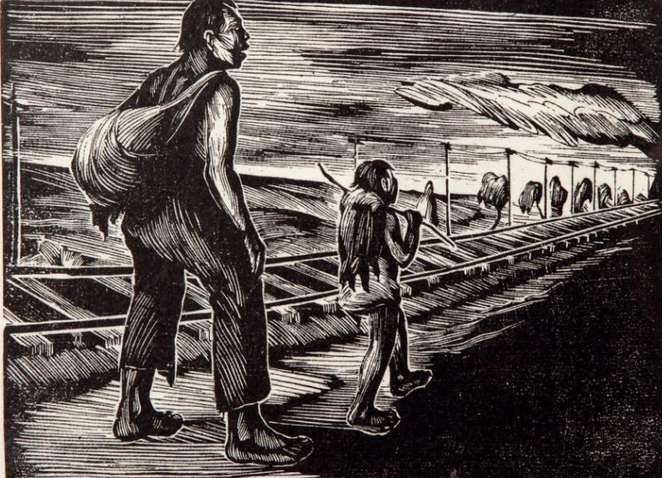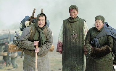 眼见逃荒的人越来越多,王老六背起自己的全部财产,一袋红薯,也加入到逃荒的队伍中来。走到半路,老六碰到饿得只剩一口气的父子二人,父亲背上也背着一个很重的袋子。那人见老六背着那么多红薯,便向老六讨要一个给孩子吃,老六不肯。