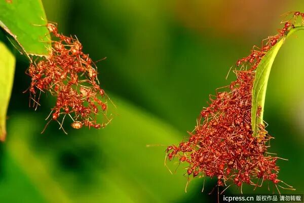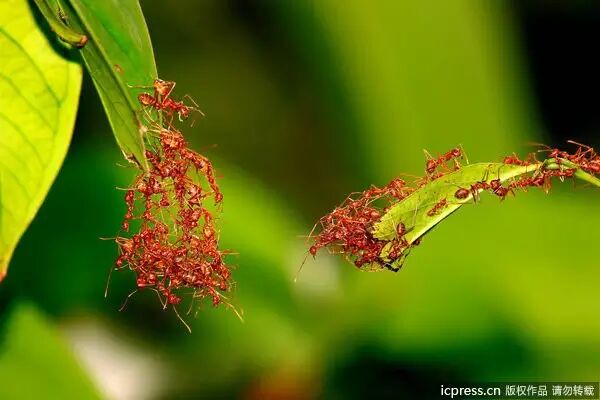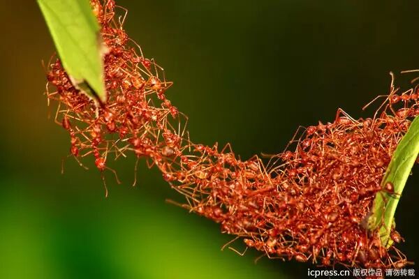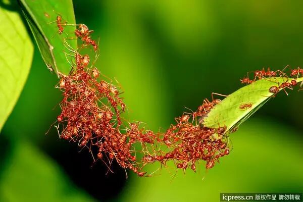 “团结就是力量”,照片中的小蚂蚁用自己的行动充分体现了团队精神的重要性。这些小家伙分别位于两片叶子上,当中相隔很长一段距离,于是它们灵机一动,用自己的“血肉之躯”搭建成“桥梁”,成功的紧密联合起来,方便自己的同伴在“桥梁”上通行。